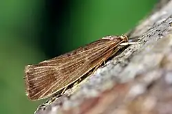 The wingspan is 20–28 millimetres (0.79–1.10 in). The forewings are whitish ochreous to reddish-ochreous, usually more or less suffused with dark purplish-fuscous, especially on a longitudinal discal streak dilated posteriorly, veins often marked with pale streaks; often several dark fuscous dots on fold, and a suffused dark spot in disc at 2/3. Hindwings ochreous-whitish to whitish-grey, lower half of termen suffused with grey. The larva is grey or whitish; head reddish-brown; 13 much flattened.[2]