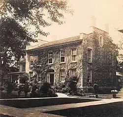 In 1823, Orville Hungerford began to construct the largest house in Watertown on a piece of property that he purchased in 1816 for $500.00 from Olney and Eliza Pearce.[81] In front was a "glorious" English garden laid out to Orville's specifications.[82] The outer walls of the home were made out of native limestone. The inside had 14 bedrooms and 10 fireplaces to keep the occupants warm.[83] An ox team hauled the "black Italian marble mantel" from Albany.[82] Construction on the main house continued through 1824.[84] On November 11, 1825, Orville opened the six-paneled door with a brass eagle-knocker at 336 Washington Street and moved into his mansion.