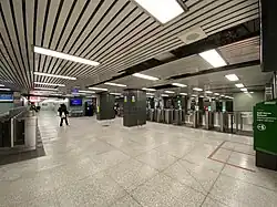 When Osgoode was built, some utility lines were relocated away from the station to allow for a future "Lower Osgoode" station on the projected but never-built Queen Street subway, but unlike at Lower Queen, no actual construction took place. When it opened, Osgoode, like St. Andrew station, boasted Vitrolite tiles on its walls.[3] Cracks resulting from the high water table at the station forced the TTC to cover over most of these tiles in the 1970s with vertical slats along the outer walls on the far side of the tracks and ceramic tiles on structural elements on the platform itself. In 2016, the slats on the outer walls were replaced by off-white panels, evoking the original design.[4]