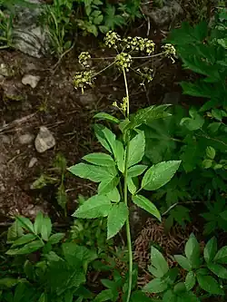 The green leaves have blades up to 20 centimeters long which are divided into toothed and irregularly cut leaflets. The blade is borne on a long petiole.[4][5]