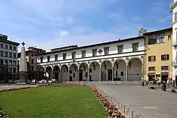 Of the original structures, the long dormitory hall, the Corsia is accessed by Via Palazzuolo. The Loggia (1489–1496) facing the piazza is supported by Corinthian columns, and was influenced by Brunelleschi's Loggia for the Foundling Hospital at Piazza Santissima Annunziata. In the spandrels are tondos of Franciscan saints by Andrea della Robbia. In the center is a bust of Ferdinando I de'Medici (circa 1594) by Pietro Francavilla. The portal to the church has a Della Robbia terracotta lunette of the Encounter of Sts Francis and Dominic [2]
