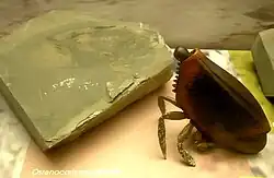 It is believed to be a bethonic animal and one of the most important necrophagous animals of its environment. Ostenocaris is the most common fossil of the formation, and the main identified thylacocephalan from the formation. In the first interpretations, the genus was shown as a filter-feeding organism, which used the cephalic sac as a burrowing organ to ensure adhesion to the substrate.[3] Based on the presence of Coprolites associated to the genus, with abundant masses of alimentary residues (hooks of cephalopods, vertebrates, remains of Crustacea) in the stomach of these organisms, Ostenocaris cypriformis was probably a necrophagous organism, and the cephalic sac can be tentatively interpreted as being a burrowing organ employed during the search for food, or as an organ of locomotion with intrinsic motility.[3] Later studies agree that cephalic sac is actually extremely large compound eyes.[4]