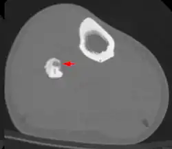 An osteoid osteoma is a benign (non-cancerous) bone tumor that arises from osteoblasts and some components of osteoclasts. It was originally thought to be a smaller version of an osteoblastoma. Osteoid osteomas tend to be less than 1.5 cm in size. The tumor can be in any bone in the body but are most common in long bones, such as the femur and tibia. They account for 10 to 12 percent of all benign bone tumors and 2 to 3 percent of all abnormal bone growths.[1] Osteoid osteomas may occur at any age, and are most common in patients between the ages of 4 and 25 years old. Males are affected approximately three times more commonly than females.[2] Osteoid osteomas are different than osteomas, which are rather found in older patients and localized in the skull.