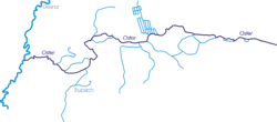 The Oster (Ukrainian: Остер) is a river in the northern Ukrainian oblast of Chernihiv. The river is a left tributary of the Desna River. It is approximately 199 km long and its basin area is 2,950 km2. It is connected by canals and streams with the Trubizh River, which flows southwest from Kyiv into the Dnieper River. Important towns and villages on the river include: Nizhyn, Kozelets, Roslavl and Oster.[1][2][3]