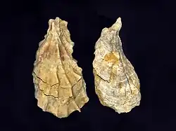 Although molecular studies suggest that Ostrea first appeared around the Eocene and originated no earlier than the Cretaceous, paleontologists have historically applied the genus to almost all fossil oysters from the Permian onward, many of which are only superficially similar to extant Ostrea.[1] As a result, the genus Ostrea includes about 150 extinct species.[2][3]