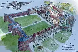 It appears from sporadic records that by the time of Henry VIII’s accession, Archbishop William Warham had begun remodelling and extending the medieval house.[6] In 1514, Archbishop Warham, frustrated by the City Fathers at Canterbury who refused to allow him to build a new palace there, commenced work in Otford. According to his friend Erasmus, "he left nothing of the first work, but only the walls of a hall and of a chapel."[7] He added the North, East, and West Ranges around a great courtyard. The enlarged palace predated Cardinal Wolsey's Hampton Court and was only slightly larger in extent. Visitors to the palace included Erasmus, a close friend of William Warham, and Hans Holbein the Younger.