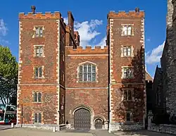 An external stair at the south end led to a two-room lodging on the first floor, flanking a central room over the gate passage.[6] The gatehouse features late Gothic details.[6] It is documented to have had three roofs, suggesting there were likely three storeys, with a single tall central room.[6] Cliff Ward, in his guide to the palace, suggests that there may have been four or five storeys in the gatehouse.[3] It was similar to, but less grand than, those at Lambeth (1490) and Hampton Court.