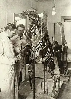 Apart from his publications, Jaekel's most prominent contribution to vertebrate paleontology lies in the excavations in Wildungen (1890-1903) and Halberstadt (1909-1912), both of which he supervised. In Wildungen, various forms of Devonian fishes were excavated, while Halberstadt yielded a large number (more than thirty) of the dinosaur Plateosaurus.[5][6] He described a second species of Plateosaurus in 1914.