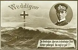 When the German submarine force was rebuilt, the first newly founded flotilla was named after Weddigen in 1935.[11] Karl Dönitz was the first commander. The boat U-9, like Weddigen's U-9, bore the Iron Cross as a turret badge. Department 6/160 of the Reich Labor Service in Herford was also named after Weddigen. In 1937, the newly built youth hostel in Wilhelmshaven - Rüstringen was given the name Weddigen Youth Hostel. During this time, Leitz built both an underwater camera and a pair of prism binoculars called Weddigen under the brand name Leica. In Herford in 1937, a monument to Weddigen by Ernst Paul Hinkeldey was erected.[12]