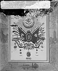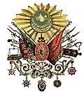 At the heart of the design is a shield adorned with a turban, which serves as the "crown" of the Ottoman monarch. Above the shield, a sun symbolizes the grandeur of the nation, upon which the sultan's tughra and chosen motto are inscribed. To the left, a red book and a green book represent the Islamic and modern laws of the empire. Atop these books, a scale stands as a symbol of justice. The blooming flowers near it also represents justice in Islamic symbolism. Encircling the shield are an assortment of weapons, balancing ancient armaments with modern weaponry. A red flag representing the secular institutions of the state stands alongside the green Standard of the Caliph. Beyond the coat, the Ottoman Orders of Merit are displayed.[1][2]