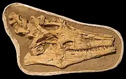 A near-shore marine lizard.[44] Originally described based only on a small number of isolated vertebrae. Discovery of further vertebrae and ribs in Morocco and Syria allowed in 2011 for classification in the Varanoidea, in a new family Pachyvaranidae.[44] Osteoderms were originally referred to this taxon but likely come from fish instead, perhaps Stratodus.[44]