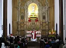 In October 1737, the Book of Deaths started to register deaths in Corumbá de Goiás, where the Chapel of Our Lady of Peñafrancia, inaugurated in 1734 and subordinated to the Rosary Parish, began to be attended by Father Antônio Soares.[1][9] The Chapel of Peñafrancia, elevated to the status of Mother Church in 1840, was the pioneer of the parishes of Abadiânia, Alexânia and Cocalzinho.[10][11][12] The Portuguese influence of the Our Lady of the Rosary Parish replicated the traditions of Pirenópolis in the Chapel of Peñafrancia in Corumbá, such as the Brotherhood of the Blessed Sacrament, Holy Week celebrations, Feast of Saint Sebastian, Feast of the Divine, Choir, Orchestra and band in the masses and processions, as well as the Cavalhadas, held in the city in September during the patron saint's feast.[9]