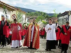 Nowadays, the celebration of the Palm Sunday, as well as the other celebrations, follow the rite promulgated by the Second Vatican Council, and begins at the windows of the Church of Our Lord of Bonfim. Upon arrival, the priest greets the people in the usual way, recites the prayers, and sprinkles the branches with holy water. The proclamation of the Gospel is made and then the procession is announced. At the beginning of the procession, immediately in front, goes the acolyte with the lighted thurible, and then, according to ancient local custom, the cruciferary, a Brother of the Blessed Sacrament with the ornamented cross; two Brothers leading the lanterns forming the wing of the faithful on the sides of the street in single line. In the center, the youth group of the Stations of the Cross Pastoral, followed by the guild of the Brotherhood of the Blessed Sacrament with the parish priest, accompanied by the Phoenix Band that performs the traditional dobrados and festive marches from its repertoire. When the priest arrives at the Mother Church, where the altar for the outdoor mass is located, he continues the celebration in the usual way, without the presence of the traditional choir and orchestra. On Palm Sunday evening and Holy Monday, the other celebrations of the Feast of the Steps take place.[42]