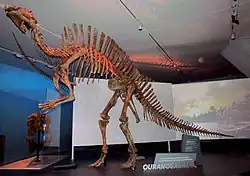 Taquet formally described the two mostly-complete specimens MNHN GDF 300 and MNHN GDF 381 from the first and fourth expeditions as Ouranosaurus nigeriensis in 1976, along with a referred coracoid and femur that bore the numbers MNHN GDF 301 and MNHN GDF 302 respectively. MNHN GDF 300 was made the holotype, and was the primary specimen described, including a semi-articulated skull lacking the left maxilla, right quadratojugal and the articulars, almost the entire vertebral column, forelimbs lacking a few hand bones, and most of the right hindlimb and a few bones of the left.[1] Additional description for bones unpreserved in the holotype was based on Taquet's MNHN GDF 381, which was not mentioned as having been sent to Venice and renumbered as MSNVE 3714, although this was confirmed by Italian palaeontologist Filippo Bertozzo and colleagues in 2017. The holotype itself was returned to Niger after being described and having its bones cast and mounted, and is now on display at the Musée National Boubou Hama in Niamey.[3] The generic name Ouranosaurus carries a double meaning, it is both taken from Arabic meaning "valour", "bravery " or "recklessness" and also from the local Tuareg language of Niger where it is the name they call the desert monitor. The specific name refers to Niger, the country of discovery. Taquet had used the name "Ouranosaurus nigeriensis" previously, first in a public presentation of the skeleton MNHN GDF 300 in July 1972, then later in September 1972 in a news article and again in December 1972 in a book; only the book bore any images associated with the name, and none of the earlier mentions had a diagnosis to make the name valid.[1]