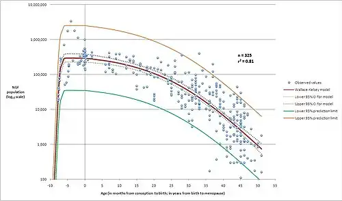 - ^ Wallace WHB, Kelsey TW (2010). "Human Ovarian Reserve from Conception to the Menopause". PLOS ONE. 5 (1): e8772. arXiv:1106.1382. Bibcode:2010PLoSO...5.8772W. doi:10.1371/journal.pone.0008772. PMC 2811725. PMID 20111701.