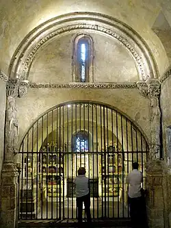 The cathedral was also called Sancta Ovetensis;[4] owing to quantity and quality of relics contained in the Cámara Santa (English: Holy Chamber). The Holy Chamber is the only surviving portion of the ancient high-medieval complex. It was built to keep such relics and treasures associated with the Asturian monarchy as the Cross of the Angels, Victory Cross, and the Agate Box or Agate Casket.