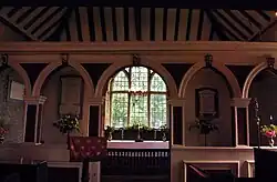 The first written mention of a church at Owthorpe dates from 1299.[23] However, some features of St Margaret's date from the 12th century. Thereafter the structure underwent many changes over the centuries. It was rebuilt about 1650,[15] and has recently undergone further repairs. The north wall is a surviving part of the original, larger church. Inside it has an oak-panelled, three-decker pulpit-cum-lectern with a Jacobean canopy, which is still in use.[25] The octagonal castellated font[26] is thought to be from the 15th century. A wooden screen dividing the nave from the chancel is said to have come from Owthorpe Hall.[23]