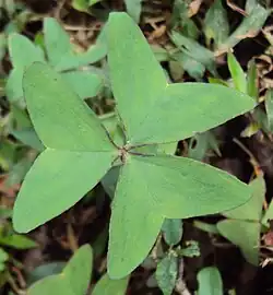This is a perennial herb growing from a system of small bulbs and spreading via stolons. There is no stem. The leaves arise on long petioles from ground level, each made up of three widely heart-shaped leaflets about 4.5 centimeters wide.