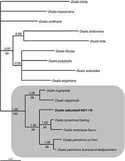 The species is a member of the Oxalis tomentosa alliance, which includes O. oligophylla Salter, O. hygrophila Dreyer, O. tomentosa L., O. palmifrons Salter, and O. saltusbelli.[3]