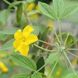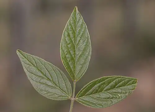 Oxalis psoraleoides is a hairy shrub up to 2 m tall and woody stems up to 1 cm in diameter. Leaves have three leaflets, with the center leaflet larger than the other two, and a long petiole up to 11 cm). The leaf blade is obovate or oblong, 1.5–6 cm long by 1–4 cm wide, and hairy on both sides. The inflorescence is a cyme with up to 50 actinomorphic (regular) flowers with five yellow petals, each up to 1.5 cm long. The fruit is a hairy subglobose capsule with one seed.[6]