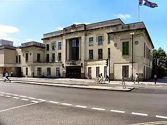 The new showroom was designed by Henry Smith in the neoclassical style, built in yellow ashlar stone and was completed in 1932.[3] The design involved a symmetrical main frontage of nine bays facing onto St Aldate's with the end pays projected forward as pavilions. The central bay featured, on the ground floor, an opening with three doorways and, spanning the first and second floors, a tall aedicula, formed by two vertically-stacked oriel windows flanked by Ionic order columns and piers supporting an entablature. The wings, which featured a curved section which swept round to meet the end bays at ground floor level, were fenestrated by sash windows on the first and second floors. The end bays, which were only two storeys high, were fenestrated in a similar style. Internally, the principal room was a large display area.[4]