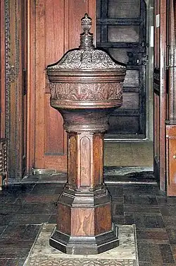 The chapel contains a double row of stalls facing each other in collegiate fashion. The west door is surrounded by a doorcase consisting of carved Corinthian pilasters and an entablature. The reredos contains two twisted Solomonic columns framing panels containing the Ten Commandments, and outside them are panels with the Lord's Prayer and the Creed. At the top of the reredos is an open pediment enclosing a flaming urn. Above the central panels is a cartouche, and over the side panels are smaller closed pediments. The sanctuary is paved with black and white marble. The roof is in five bays. The wooden font dates from the 17th century. It has an octagonal base, a richly carved circular bowl, and a dome-shaped cover. From the roof hangs an eight-branch candelabrum. In the chapel is a wall tomb to Sir James Altham, who died in 1616, and his last wife Helen, who died in 1638. It consists of two praying figures facing each other in an alabaster and marble frame, consisting of Corinthian columns and an open segmental pediment containing a cartouche flanked by obelisks. At the west end is a marble memorial tablet to John Askill Bucknall dated 1797 by C. Regnant.[1]