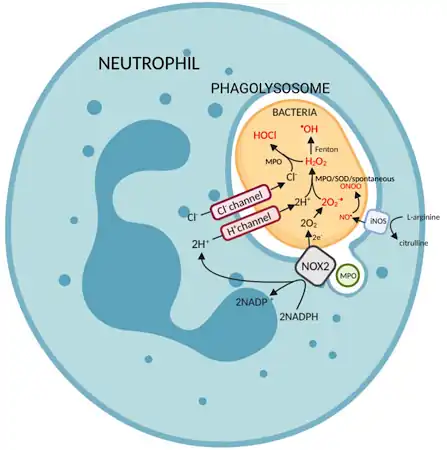 - ^ Hampton MB, Kettle AJ, Winterbourn CC (November 1998). "Inside the neutrophil phagosome: oxidants, myeloperoxidase, and bacterial killing". Blood. 92 (9): 3007–17. doi:10.1182/blood.V92.9.3007.421k47_3007_3017. PMID 9787133. S2CID 45991444.