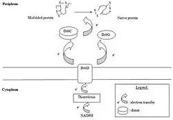 Especially for proteins that contain more than one disulfide bond, it is important that incorrect disulfide bonds become rearranged. This is carried out in the isomerization pathway by the protein DsbC, that acts as a disulfide isomerase. DsbC is a dimer, consisting of two identical 23 kDa subunits and has four cysteine residues in each subunit. One of these cysteines (Cys-98) attacks an incorrect disulfide in a misfolded protein and a mixed disulfide is formed between DsbC and this protein. Next, the attack of a second cysteine residue results in the forming of a more stable disulfide in the refolded protein. This may be a cysteine residue either from the earlier misfolded protein or one from DsbC. In the last case, DsbC becomes oxidized and must be reduced in order to play another catalytic role. There is also a second isomerase that can reorganize incorrect disulfide bonds. This protein is called DsbG and it is also a dimer that serves as a chaperone. To fulfil their role as isomerases, DsbC and DsbG must be kept in a reduced state. This is carried out by DsbD, which must be reduced itself to be functional. Thioredoxin, which itself is reduced by thioredoxin reductase and NADPH, ensures the reduction of the DsbD protein.
