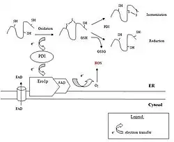 A homolog of DsbA, called protein disulfide isomerase (PDI), is responsible for the formation of the disulfide bonds in unfolded eukaryotic proteins. This protein has two thioredoxine-like active sites, which both contain two cysteine residues. By transferring the disulfide bond between these two cysteine residues onto the folding protein it is responsible for the latter's oxidation. In contrast to bacteria, where the oxidative and isomerization pathways are carried out by different proteins, PDI is also responsible for the reduction and isomerization of the disulfide bonds. For PDI to catalyse the formation of disulfide bonds in unfolded proteins, it must be reoxidized. This is carried out by an ER membrane-associated protein, Ero1p, which is no homolog of DsbB. This Ero1p protein forms a mixed disulfide with PDI, which is resolved by a nucleophilic attack of the second cystein residue in one of the active sites of PDI. As result, oxidized PDI is obtained. Ero1p itself is oxidized by transferring electrons to molecular oxygen. As it is an FAD-binding protein, this transfer of electrons is strongly favoured when Ero1p is bound to FAD. Also a transport system that imports FAD into the ER lumen has been described in eukaryotes. Furthermore, it has been shown that the ability to reduce or rearrange incorrect disulfide bonds in misfolded proteins is provided by the oxidation of reduced glutathione (GSH) to oxidized glutathione (GSSG).