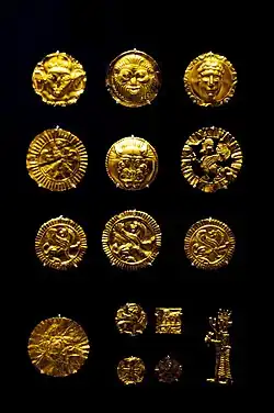 A stylized birds-head ornament can be recognised, like the finely-decorated scabbard of "Median" shape, as very similar to that of a soldier from a Persepolis relief, where it forms the crest to his bow-case.[19] These seem to be the only items relating to weapons, though other pieces may have decorated horse harness.[20] Another group of plaques were probably bracteates intended to be sewn onto clothing through the small holes round their edges. These have a variety of motifs, including the face of the Egyptian dwarf-god Bes, lion-griffins, a sphinx, and a cut-out figure apparently showing a king (see illustration below; Bes is centre in the top row, the king at bottom right).[21]