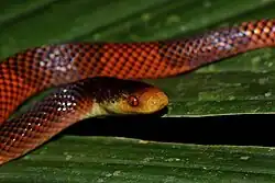 Oxyrhopus formosus (vernacular names: beautiful calico snake, Formosa false coral snake) is a neotropical snake[2][3] of the family Dipsadidae. Its distribution is not fully understood, because of inaccurate identifications and confusion with other Oxyrhopus species. It has been reported from Brazil, Colombia, and Peru. Reports from the Guiana region are based on misidentified O. occipitalis.[4] Oxyrhopus formosus are robust, the head is entirely yellow, and adults are red with prominent black bands; O. occipitalis are slender, the snout is yellow and the top of head is brown, and adults are red with faint crossbands.