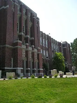 Several school buildings preceded this one. This Art Deco building replaced the first high school building completed in 1901 on Anstice Street. The new school had modern features, including classroom loudspeakers, an auditorium with balcony and projection booth, a central vacuuming system, and one of the most modern gymnasiums in Nassau County. After 70 years the gym had become outdated. It was replaced in 2000 with a new state-of-the-art gymnasium, dedicated to Dr. Howard Imhof. The 2000 additions also included a new library-media center.