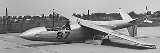 The pilot was positioned just ahead of the wing, and sat under a bubble canopy. A centrally located Continental C85 engine powered, via an extension-shaft, a two-bladed fixed-pitch propeller positioned aft of the empennage. The aircraft had a Y tail configuration, with an inverted tailfin that ensured that the propeller had sufficient ground clearance. Its undercarriage consisted of tandem main wheels, partially recessed into the underside of the fuselage. Skateboard wheels were attached to the trailing edge of each wingtip.[2][3]