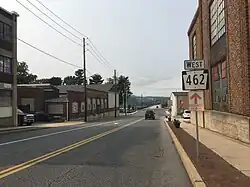 The western terminus of PA 462 is at a trumpet interchange with US 30 in West Manchester Township, York County, where US 30 heads east on a freeway and west on at-grade West Market Street. From this interchange, PA 462 heads northeast on four-lane divided West Market Street through commercial areas, soon narrowing to a three-lane road with a center left-turn lane. The road passes between industrial areas to the northwest and residential neighborhoods to the southeast before it crosses a York Railway line at-grade. The route runs past businesses and comes to an intersection with the eastern terminus of PA 234. PA 462 narrows to two lanes and heads east past homes, coming to a junction with the western terminus of PA 182 in the community of Kurtz Place. The road enters the borough of West York and is lined with more residences along with a few businesses. Farther east, the route becomes the border between West Manchester Township to the north and West York to the south as it passes to the south of the York Fairgrounds, crossing the York Railway tracks again at-grade. PA 462 continues into the city of York and passes residential and commercial development as a four-lane undivided road, reaching a junction with PA 74.[2][3]