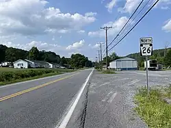 PA 26 begins at the Maryland state line (Mason–Dixon line) in Union Township, Fulton County, where the road continues south into that state as North Orleans Road. From the state line, the route heads north on two-lane undivided South Clear Ridge Road through forested areas with some farm fields. PA 26 comes to an intersection with the western terminus of PA 484, where it makes a turn to the west.[2][3] PA 26 enters Mann Township in Bedford County as Clear Ridge Road, heading northwest through woodland with some fields. The road curves north and winds through more rural land before making two sharp turns; first towards the west and second towards the north. The route winds north through forests, running through the community of Piney Creek. PA 26 passes through tracts of Buchanan State Forest, turning to the northwest. The route crosses into Southampton Township and reaches Millers Corner, where it turns northeast to remain along Clear Ridge Road. The route enters Monroe Township and leaves the state forest, continuing northeast through a mix of farmland and woodland. PA 26 makes an S-curve as it winds through rural land, passing through the communities of Five Forks and Chapmans Run. Farther north, the road reaches the residential community of Clearville, where it turns to the northwest. The route runs through farm fields with some woods, turning to the northeast. PA 26 continues north-northeast through a mix of farms and wooded areas, crossing into West Providence Township. The road passes through more rural land before heading northwest through more developed areas and passing under I-70/I-76 (Pennsylvania Turnpike). Following this, the route heads into the community of Earlston, where it passes homes. In Earlston, PA 26 heads west as East 4th Avenue before it makes a turn north onto State Street.[2][4]