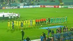 In the 2014–15 UEFA Champions League, Ludogorets again won both their qualifiers, against F91 Dudelange of Luxembourg and Partizan.[16][17] In the play-off, they defeated Steaua București to reach the group stage for the first time. Goalkeeper Vladislav Stoyanov was dismissed for a second yellow card in the last minute of extra time in the second leg, when Ludogorets had used all their substitutes. In the penalty shoot-out, centre-back Cosmin Moți, having converted the first penalty, went in goal and made two saves to put Ludogorets through 6:5 on penalties.[18]