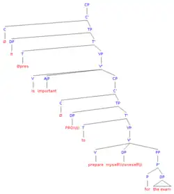 The claim that non-finite clauses have a phonologically null PRO subject is in part motivated by binding theory — in particular, the idea that an anaphor requires a local antecedent to be present. Reflexive pronouns such as myself and oneself require a local antecedent. As shown in (4), PRO can function as an antecedent for reflexives: in (4a) PRO is the antecedent for the reflexive pronoun 'myself', and in (4b) PRO functions as the antecedent for the impersonal reflexive oneself. If the null subject PRO were not present in examples like (4a) and (4b), then non-finite clauses would contain anaphors that lacked a local antecedent, and incorrectly predicting that such sentences to be ungrammatical. The grammaticality of such sentences confirms that the reflexives have an antecedent, which by hypothesis is PRO.[3]