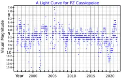 In 1956, R. Weber announced his discovery that the star's brightness varies.[17] PZ Cas is a slow semi-regular variable star with the period quoted as 925 days in the General Catalogue of Variable Stars,[18] although periods of 850 and 3,195 days have been derived.[6][3] The visual range is approximate magnitude 8–10, large for this type of variable.[3]