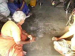Games similar to chaupar with different colour schemes along with dice have been identified from the Iron Age during the Painted Grey Ware period from sites in Mathura and Noh (1100–800 BC).[4][5] Cruciform boards have been depicted from art reliefs of Chandraketugarh dated to 2nd–1st century BC. A 6th- or 7th-century representation of Shiva and Parvati said to be playing Chaupar (a closely related game)[6] in fact depicts only dice and not the distinctive board.[7] In a similar period, a board identical to pachisi was discovered in the Ellora cave system. A Song dynasty (960–1279) document referencing the Chinese game Chupu (Chinese: 樗蒲; pinyin: chūpú),[8] "invented in western India and spread to China in the time of the Wei dynasty (AD 220–265)"[9] may relate to Chaupar, but the actual nature of the Chinese game (which may be more closely related to backgammon) is uncertain. Speculation that Pachisi derived from the earlier game of Ashtapada is plausible but unsubstantiated.[7]