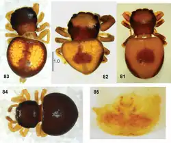 The spider's carapace, the hard upper part of the cephalothorax, is wider than it is long with an eye field that takes up half of its area.[4] The carapace is generally brown apart from black areas around the eyes, although some specimens have two large yellowish patches in their eye fields. The sternum, the underside of the cephalothorax, is rounded and brown. Its mouthparts are brownish, with white tips at the ends of the labium and maxillae. The spider's chelicerae have three short teeth at the front and a single tooth with serrated edges and four tips at the back. The female is similar in shape to the male.[13]