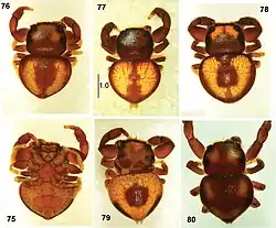 Pachyballus ornatus is a wide-bodied spider that resembles a beetle.[9] It is small and very flat with a strongly pitted exterior that shows signs of sclerotization. The spider's body is divided into two main parts, a cephalothorax to the front and, behind that, an abdomen. The male has a cephalothorax that measures between 1.2 and 1.7 mm (0.05 and 0.07 in) in length and between 1.5 and 1.8 mm (0.06 and 0.07 in) in width. It abdomen is larger than the cephalothorax, measuring between 1.7 and 2.3 mm (0.09 in) in length and between 1.8 and 2.4 mm (0.09 in) in width.[4] The female is similar in size to the male. It has a cephalothorax that measures between 1.3 and 1.5 mm (0.051 and 0.059 in) in length and between 1.4 mm (0.055 in) and 1.8 mm in width and abdomen between 1.9 and 2.1 mm (0.075 and 0.083 in) in length and 2 and 2.2 mm (0.079 and 0.087 in) in width.[13]
