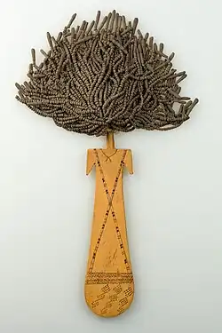Paddle dolls are made of thin pieces of wood which depict the torso of a woman with truncated arms and no legs. Thick "hair" is represented by small beads strung along string, which are often made from black mud.[1][4] The necks often are adorned with collars, and the torso with a patterned textile or other jewellery.[1] The breasts and pubic triangle are painted on and Morris notes that "extraordinary prominence given to the pubic triangle" and "pubic triangles are the one constant in the iconic repertoire of the paddle dolls."[2] They will often also have tattoos in diamond shapes, and in the forms of deities or animals.[1] One such example is a frog found on the reverse side of a paddle doll now at the Egypt Centre, Swansea.[5]