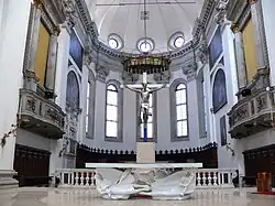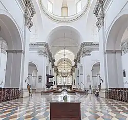 The nave is flanked by an aisle on each side, harmoniously matched with the nave. The central nave has two large elliptical domes, matched to the chapels of St. Gregory Barbarigo and San Lorenzo Giustiniani. A large circular dome rises over the crossing. Chapels line the side aisles. Under the presbytery, the crypt is the Chapel of Santa Cross.[2]