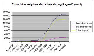By the mid-13th century, the problem had worsened considerably. The Upper Myanmar heartland over which Pagan exercised most political control had run out of easily reclaimed irrigable tracts. Yet their fervent desire to accumulate religious merit for better reincarnations made it impossible for Pagan kings to halt entirely their own or other courtiers' donations. The crown did try to reclaim some of these lands by periodically purging the clergy in the name of Buddhist purification, and seizing previously donated lands. Although some of the reclamation efforts were successful, powerful Buddhist clergy by and large successfully resisted such attempts.[6][7] Ultimately, the rate of reclamation fell behind the rate at which such lands were dedicated to the sangha. (The problem was exacerbated to a smaller degree by powerful ministers, who exploited succession disputes and accumulated their own lands at the expense of the crown.) By 1280, between one and two-thirds of Upper Myanmar's cultivatable land had been donated to religion. Thus the throne lost resources needed to retain the loyalty of courtiers and military servicemen, inviting a vicious circle of internal disorders and external challenges by Mons, Mongols and Shans.[6]