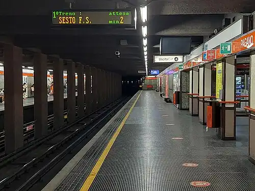 Pagano is a station on Line 1 of the Milan Metro in Milan, Italy. The underground station was opened on 1 November 1964 as part of the inaugural section of the Metro, between Sesto Marelli and Lotto. On 2 April 1966, a section from Pagano to Gambara was added.[2] It is located on Via Mario Pagano. The line branches here; trains continue toward either Bisceglie or Rho Fiera.