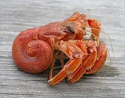 Most species of hermit crab have long, spirally curved abdomens, which are soft, unlike the hard, calcified abdomens seen in related crustaceans. They protect themselves from predators by entering a salvaged empty seashell, into which they can retract their whole body. As they grow, they must leave their shell and find another larger, more suitable shell.[64] Their shells are therefore highly valuable to them. When hermit crabs (Pagurus bernhardus) are given an electric shock, they leave their shells and subsequently perform prolonged abdominal grooming at the site of where they received the shock.[65]