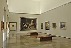 The Fine Arts Museum was moved here in 1958 and is housed on the palace's upper floor today. It displays a collection of paintings and sculptures from Granada dating from the 16th to 20th centuries. The bulk of the collection is drawn from the properties of the Catholic church, such as the Cartuja in Granada and other monasteries and convents. Among the highlights are The Burial of Christ by Jacopo Torni, Thistle Still-Life by Juan Sánchez Cotán, a Limoges enamel piece, and paintings by 20th-century artist Manuel Angeles Ortiz.[12]