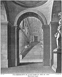 From 1799 to 1805, the architect Jean Chalgrin transformed the palace into a legislative building. He demolished the grand central staircase (escalier d'honneur), replacing it with a senate chamber on the first floor, which incorporated and destroyed Marie de' Medici's chapel on the garden side of the corps de logis. Chalgrin also enclosed the flanking terraces, making space for a library. At the same time he created a neo-classical escalier d'honneur in the west wing, a single monumental flight enclosed by an Ionic colonnade and covered with a coffered barrel vault, the construction of which resulted in the destruction of the long gallery that had formerly housed the cycle of paintings by Rubens.[9]