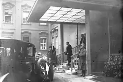 On the forecourt at the front of the palace was a so-called “courtyard” covered with gravel, on which the Reich President received foreign ambassadors and heads of state as well as other distinguished guests. In later years it was common for a twenty-member honorary formation of the Reichswehr to take a stand on the courtyard whenever the President entered or left his office. In the courtyard there was a fountain decorated with allegorical figures, behind which a wide glass staircase led to the entrance to the palace.