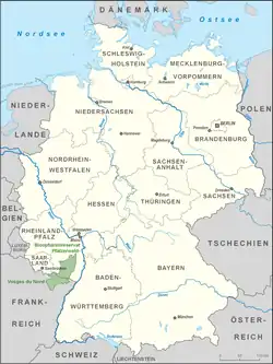 The Franco-German Palatinate Forest-North Vosges Biosphere Reserve (German: Biosphärenreservat Pfälzerwald-Nordvogesen, French: Réserve de biosphère transfrontalière des Vosges du Nord-Forêt palatine) was created in 1998 as the first UNESCO trans-boundary biosphere reserve in Europe. The German part became the 12th of 16 biosphere reserves in Germany,[1] and the French part, the 6th of 14 in France.